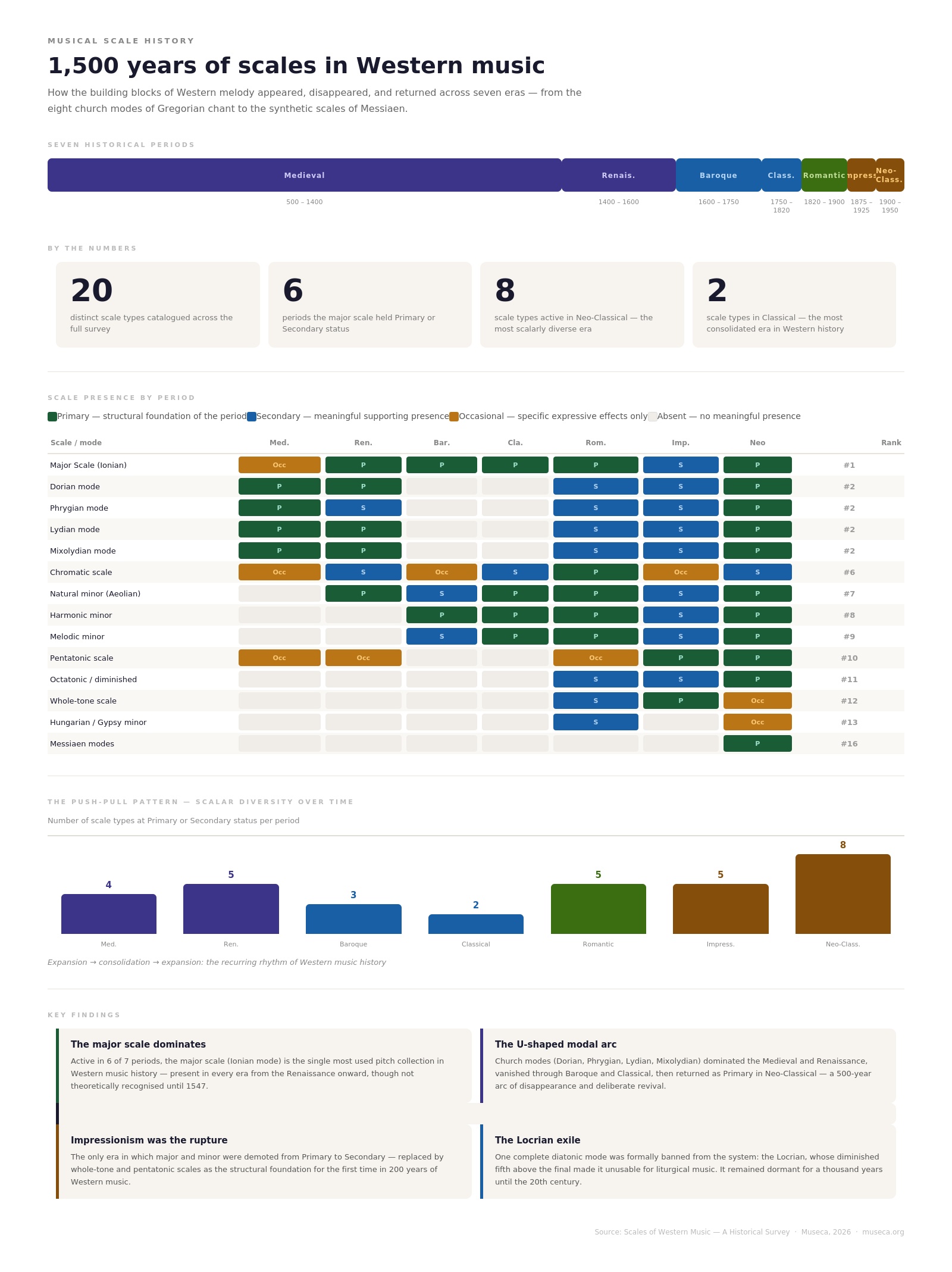 The survey covers seven historical periods — Medieval, Renaissance, Baroque, Classical, Romantic, Impressionist, and Neo-Classical — and tracks twenty distinct scale types across all seven. For each period and each scale, it asks the same questions: Was this scale a structural foundation, or a coloristic effect? Was it a deliberate revival of something older, or something genuinely new? And when it disappeared, why did it disappear — and what replaced it?