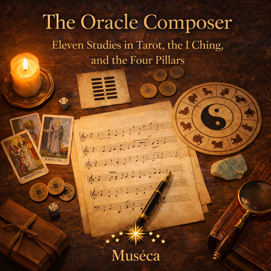 The music on this album draws from three of the oracle systems explored in The Oracle Composer: Tarot, the I Ching, and the Chinese Four Pillars. In these pieces, the Tarot’s Major Arcana become pitch, key center, and modal color; the Minor Arcana shape instrumentation, rhythm, phrasing, and articulation; the I Ching offers structural logic through yin and yang, trigrams, hexagrams, and changing lines; and the Four Pillars reveal personal musical portraits through animal symbolism, elemental balance, and inner energetic pattern. Each system becomes a compositional engine.