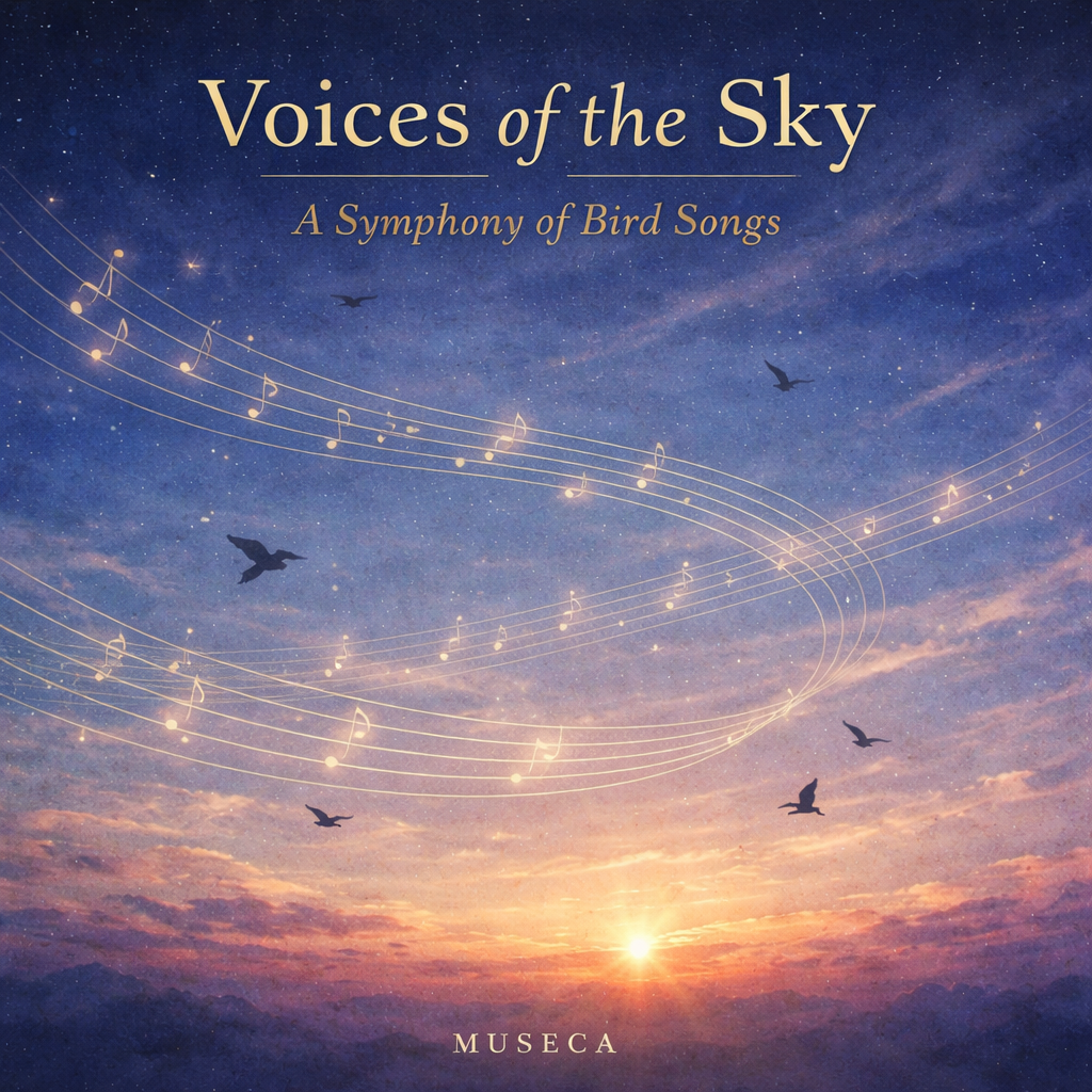 Voices of the Sky: A Symphony of Bird Songs is an album built on a simple but profound premise: that birdsong is not merely sound from nature, but music already in motion. Each track begins with the voice of a real bird and surrounds that voice with a carefully shaped musical world—never to overpower it, but to honor it, frame it, and enter into dialogue with it. The result is neither pure field recording nor conventional instrumental composition. It is an integration: the bird remains the first singer, and the music becomes its atmosphere, architecture, and emotional echo.